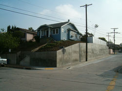 Replacement of a damaged retaining wall, sidewalk, and relocation of a sewer.
